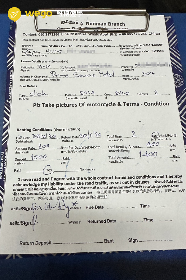 摩托車行會要求你出示以及複印你的護照,以及會察看你的國際駕照。另外會準備合約給你簽名,內容會有租車日期與天數。可以用翻譯軟體看一下相關的合約內容喔。小編租2天才400泰銖。押金1000泰銖,如果沒有毀損或違反合約規定,押金會退還喔。合約條款請看下圖範例