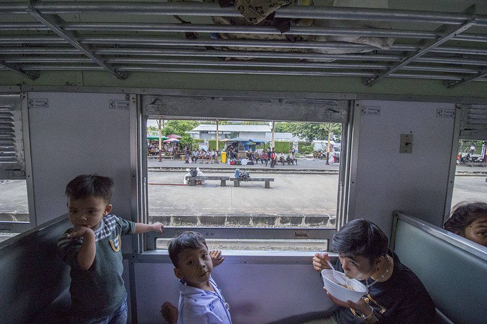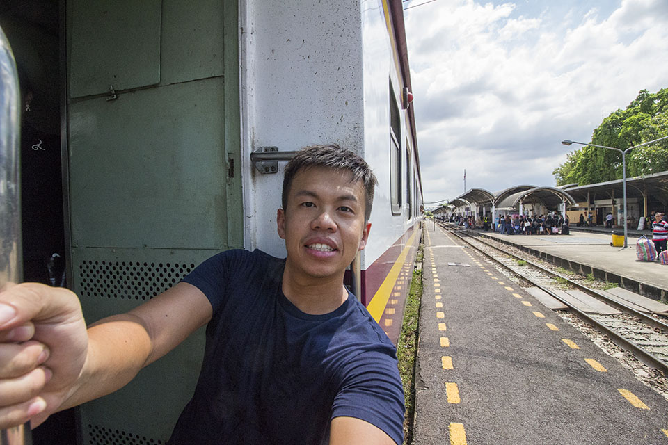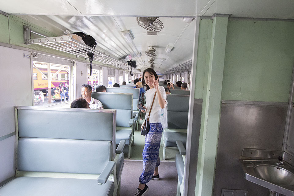 我們是真的趕在前一刻才跳上火車,可愛的Amy也很開心地回眸一笑,因為她不知道這班火車是自由座!!也沒有冷氣!!只能靠車頂上的電風扇撐一下,這在氣候比較熱的泰國真的有點吃力啊!!找到位置沒多久後~大夥其實就笑不太出來了~?
