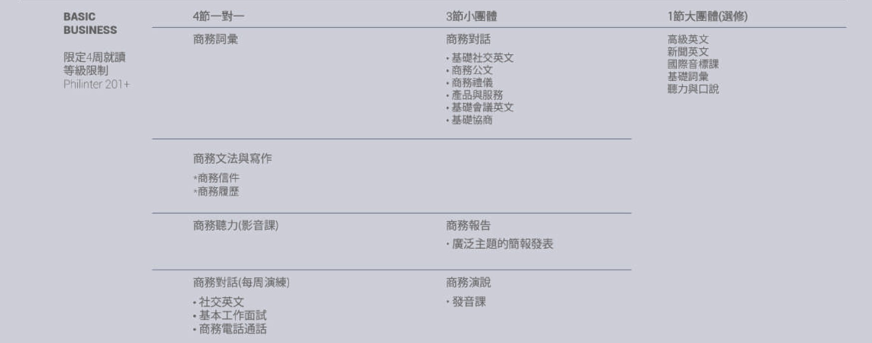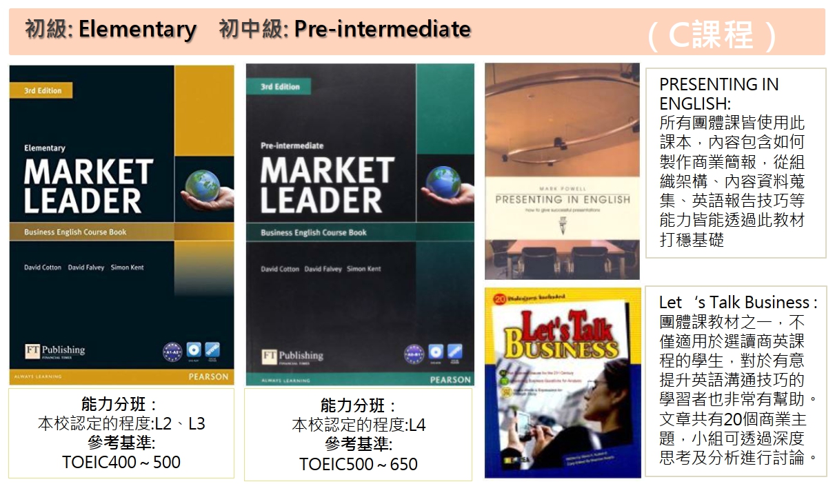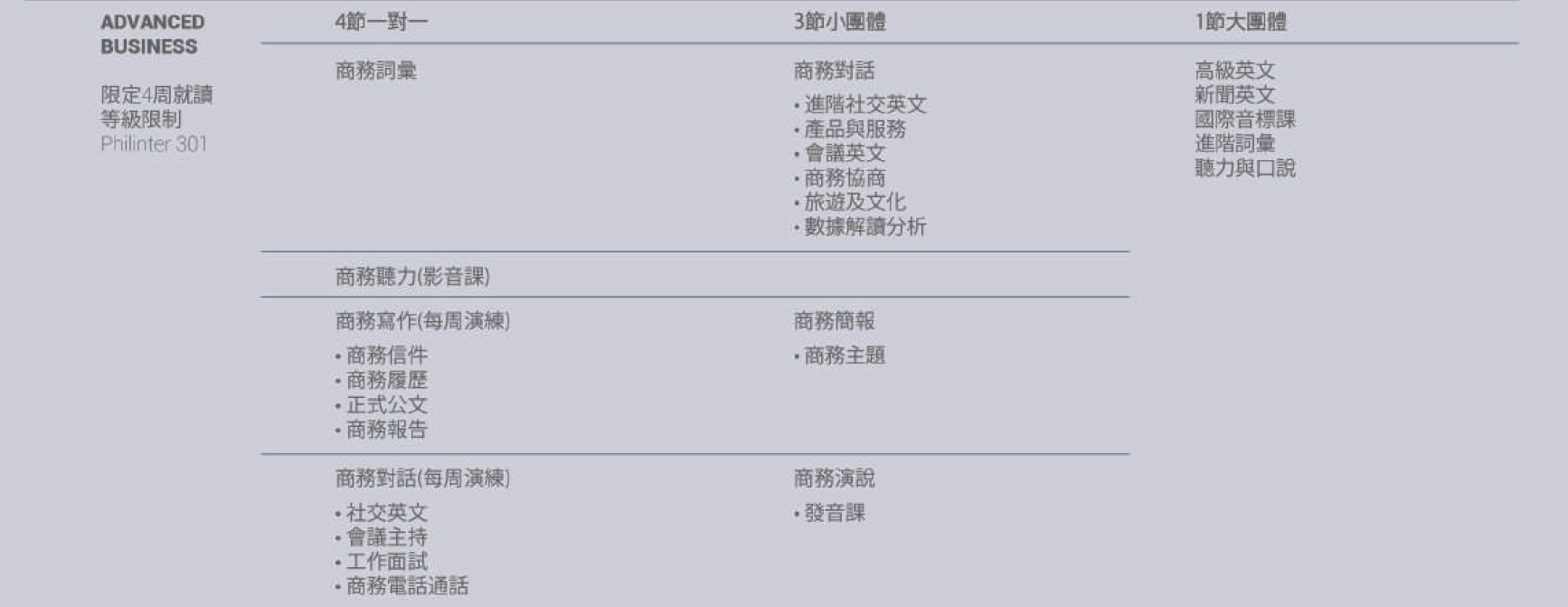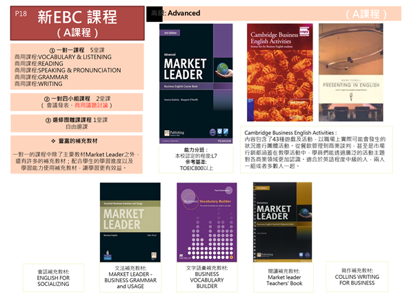 | 英文發音 | 商務禮儀 | 廣泛主題的商業簡報 |