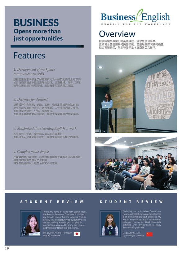 位於碧瑤,將商業英文細分三種:入職前、入職後、航空課程,針對不同領域提供專門的培訓。入職前著重在商業用語、聽力、履歷撰寫和面試技巧;入職後主要在建立學生對商業簡報的信心、商業書信的技巧、商業溝通能力為主要方向;航空課程主要協助學生準備航空業面試、顧客應對技巧、跟空服員必備的技能…等等。