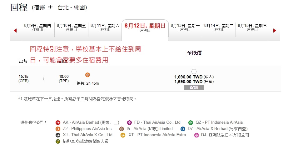 亞洲航空:6/3~10/21 亞航加開周日班機,限定期間。